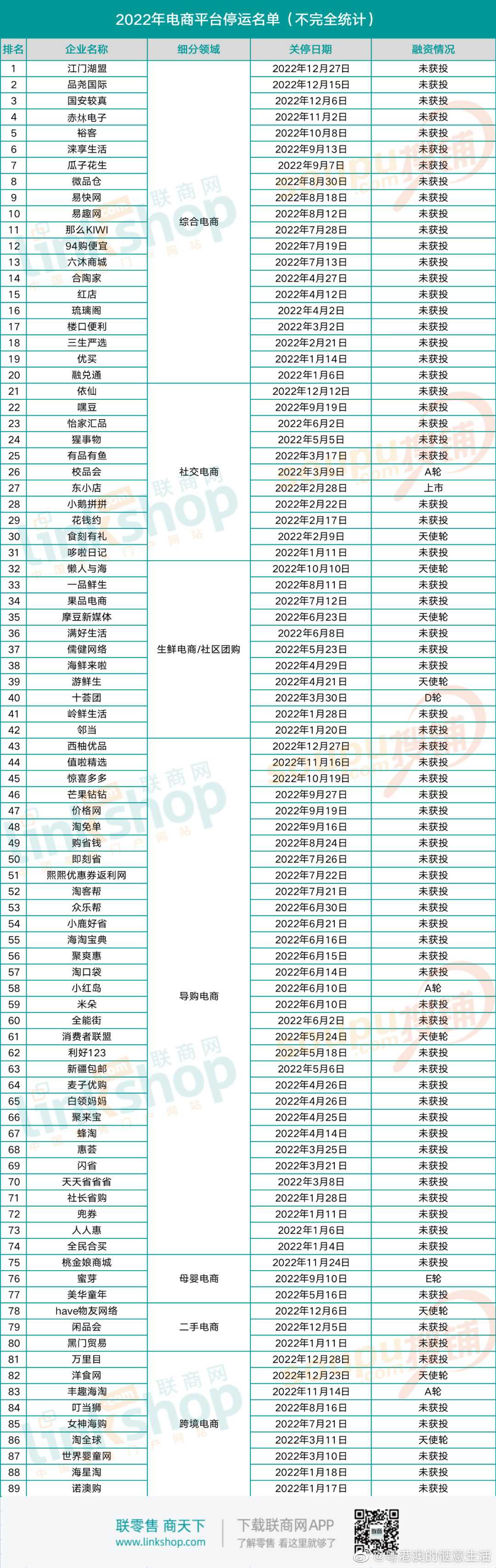 双11一直都被视作电商行业的“晴雨表”,但在去年双11,作为电商界的两大“排面”——天猫与京东却首次未对外披露“最终战报”。而购物节的冷清似乎也向外界传递出信号:电商的“寒冬”仍未结束。 2022年,在疫情反复、消费低迷、流量见顶等多重因素影响下,电商行业经历了前所未有的考验。这其中,有人“瘦身”蛰伏,有人调头求变,但也有不少企业挣扎在了生死的边缘,更有甚者就此倒下,没能听到跨年的钟声…… 据《联商网》不完全统计,2022年至少有89家电商平台关停(文末附有总表),涉及综合电商、社交电商、导购电商、社区团购/生鲜电商、跨境电商等多个细分领域。其中,也不乏一些曾被资本热捧、背靠巨头的企业,比如易趣网、丰趣海淘、十荟团、小鹅拼拼等。 89家电商平台关停,挺过5年者寥寥 从细分领域来看,89家电商平台中,导购型电商平台“死亡”比例最高,关停数达到32家,占比达到36%;综合电商平台倒闭数位居第二,关停20家,占比22.5%;社交电商与生鲜电商/社区团购在平台关停数量上不分伯仲,均为11家,并列第三。 此外,跨境电商平台关停9家,母婴电商与二手电商平台各停运3家。 从这些电商平台的融资情况来看,获得融资的其实并不多,获得多轮融资甚至上市的更是屈指可数。其中易趣网、东小店曾成功上市,蜜芽、十荟团“倒下”前最高分别获得E轮和D轮融资,获得A轮融资有三家,分别是丰趣海淘、小红岛和校品会。 除了以上几家,其余倒在2022年的电商平台中,仅8家获得过天使轮融资。据统计,未曾获得过融资就已死亡的电商平台数量达到74家,占比高达83.1%。 事实上,从融资情况便不难看出,比起一些昙花一现的品牌,那些倒在“寒冬”中的企业大多连“绚烂”一次的机会都不曾有,便早早“夭折”。 而这也体现在了平台的存活时长上。据统计,89家电商平台中生存超过5年的28家;生存超过10年的仅2家,生存超过20年的则只有易趣网一家。绝大多数电商平台的“寿命”在2-3年区间,也有个别上线仅数月便草草关停平台。 社区团购、生鲜电商:前置仓之困 短短两年时间,始于下沉市场,兴于疫情封控的社区团购宛如过山车,从“下一个百亿风口”走到奄奄一息。 如今,崛起于2020年疫情爆发初期的“老三团”——十荟团、同程生活、兴盛优选,只剩下兴盛优选还在坚持。2022年,十荟团成为了“老三团”中第二个掉队的平台。 2022年3月,十荟团被曝关停全国城市的所有业务,进入善后阶段,主要处理供应商货款的清算事宜,以及员工工资的结算赔付问题。彼时,十荟团微信小程序已无法访问,APP打开后显示空白。 事实上,早在2021年,便有多个社区团购平台“滑铁卢”,因融资困难,行业进入了“寒冬期”。因此,在2022年,不少企业选择收缩社区团购业务。比如,京东旗下京喜拼拼在2022年3月和6月进行了两轮收缩,从20个省份缩减至仅剩北京、郑州两地业务。同样,美团优选在接连关闭多地市场后,于10月份宣布转型为“明日达超市”。 而作为“老三团”独苗的兴盛优选,则在8月份陆续撤出五省,并于10月关停了河南等四省、市的业务,仅保留湖南、湖北、广东等省份维持区域经营。 与社区团购类似,以前置仓模式为运营核心的生鲜电商同样也在2022年进行收缩转型。 虽然每日优鲜平台因并未整体关停,并未被列入此次“死亡名单”,但从结果来看,每日优鲜已然奄奄一息,2022年7月28日,每日优鲜宣布关闭了占据营收九成的前置仓极速达服务,数百名员工当场被离职,十多亿供应商欠款无从索取。 公开资料显示,每日优鲜在上市前就已经拿到了11轮融资,融资金额超过了140亿元。同时,在巅峰时期的2019年,每日优鲜在全国20个城市建立了超过1500个前置仓,一举成为了行业第一。 每日优鲜“倒下”无疑为行业敲响警钟。2022年,叮咚买菜相继撤出了安徽宣城、滁州,河北唐山,广东中山、珠海,天津、厦门;盒马邻里相继退出北京、西安、成都、武汉等市场,主攻上海市场。 显然,对于行业幸存者而言,比起追求规模,如何实现盈利成为了当下第一要务。毕竟,十荟团与每日优鲜以血的经验告诉大家,融资不易的大环境中,盈利困局就是悬在头顶的“达摩克利斯之剑”。 跨境电商:从风光到没落 2022年11月,顺丰投资的自营跨境电商平台“丰趣海淘”被申请破产,据其法人、CEO任晓煜称,公司早已解散,平台早已停运,员工安置补偿也已基本完毕。 作为顺丰的“亲儿子”,丰趣海淘的停运让人嗅到了来自跨境电商领域的“寒意”。事实上,早在丰趣海淘倒下之前,不少在跨境进口领域曾赫赫有名的企业都已经不同程度的陷入困境。 其中最为典型的便是进口海淘的“十年老玩家”洋码头。尽管目前洋码头平台并未关停,但在2022年9月,洋码头被曝出“人去楼空”、拖欠货款等负面传闻。 对于现金流恶化的危机,洋码头创始人曾碧波认为疫情和拆红筹回国是导火索:一方面,航班量受疫情影响大幅减少,货品进不来;几大核心口岸对进口物资设有14天静置期,订单取消率升高。另一方面,2021年拆红筹架构时,退股退掉了很多资金,包括新浪微博的一个多亿元,银行抽贷的将近8000万元。 事实真是如此吗?或许有,但绝不是全部。毕竟,在近几年中,独立海淘平台可谓各有各的问题,近乎于“团灭”。 质量及服务问题才是洋码头等独立海淘平台失去消费者的罪魁祸首。网络消费纠纷调解平台“电