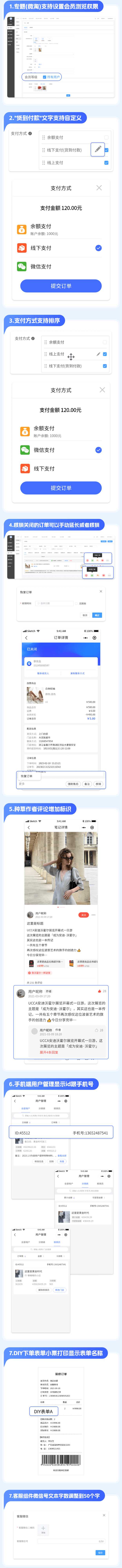 1、专题(微淘)支持设置会员浏览权限;2、“货到付款”文字支持自定义;3、支付方式支持排序;4、核销关闭的订单可以手动延长或者核销;5、种草作者评论增加标识;6、手机端用户管理显示id跟手机号;7、DIY下单表单小票打印显示表单名称;8、客服组件微信号文本字数调整到50个字。
