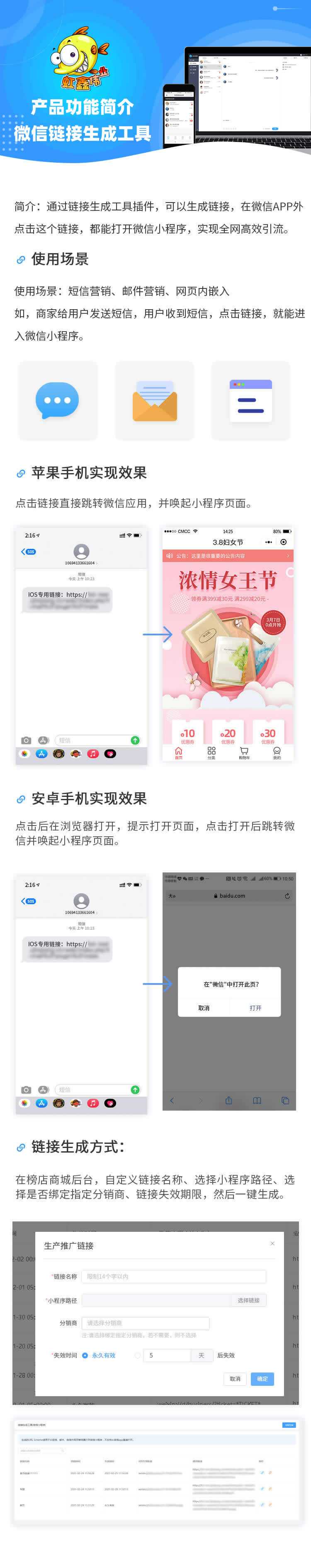 : 旗下品牌“脸粉云管家”全端SaaS小程序系统产品功能简介「微信链接生成工具」:功能:微信链接生成工具产品分类:常用工具