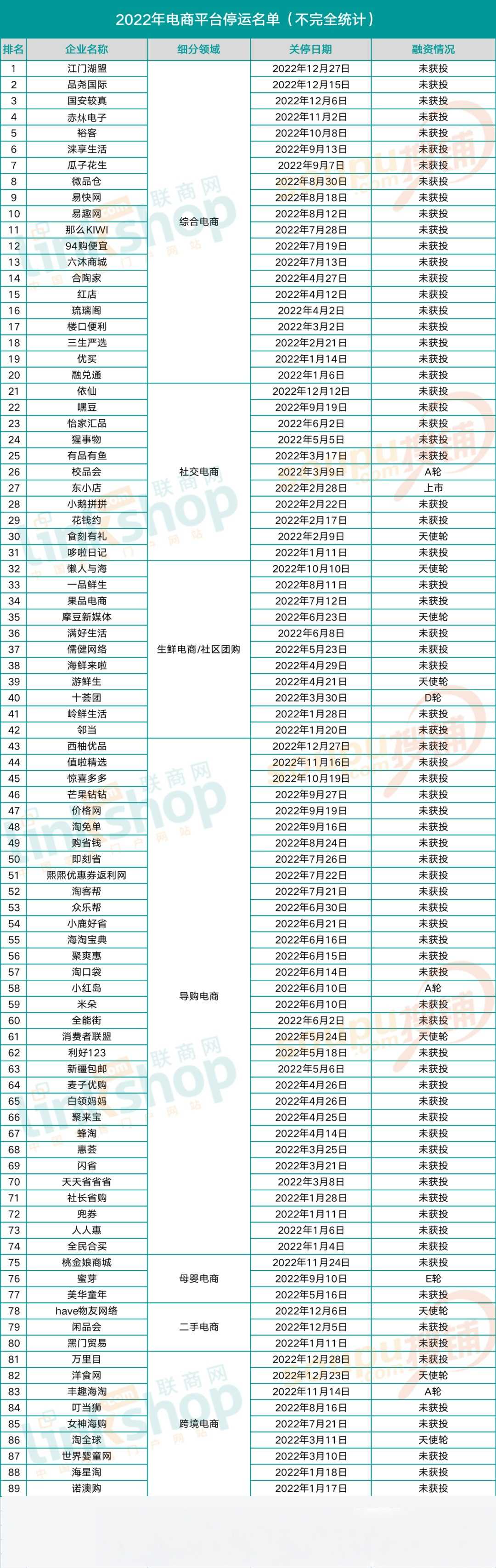双11一直都被视作电商行业的“晴雨表”,但在去年双11,作为电商界的两大“排面”——天猫与京东却首次未对外披露“最终战报”。而购物节的冷清似乎也向外界传递出信号:电商的“寒冬”仍未结束。 2022年,在疫情反复、消费低迷、流量见顶等多重因素影响下,电商行业经历了前所未有的考验。这其中,有人“瘦身”蛰伏,有人调头求变,但也有不少企业挣扎在了生死的边缘,更有甚者就此倒下,没能听到跨年的钟声…… 据《联商网》不完全统计,2022年至少有89家电商平台关停(文末附有总表),涉及综合电商、社交电商、导购电商、社区团购/生鲜电商、跨境电商等多个细分领域。其中,也不乏一些曾被资本热捧、背靠巨头的企业,比如易趣网、丰趣海淘、十荟团、小鹅拼拼等。 89家电商平台关停,挺过5年者寥寥 从细分领域来看,89家电商平台中,导购型电商平台“死亡”比例最高,关停数达到32家,占比达到36%;综合电商平台倒闭数位居第二,关停20家,占比22.5%;社交电商与生鲜电商/社区团购在平台关停数量上不分伯仲,均为11家,并列第三。 此外,跨境电商平台关停9家,母婴电商与二手电商平台各停运3家。 从这些电商平台的融资情况来看,获得融资的其实并不多,获得多轮融资甚至上市的更是屈指可数。其中易趣网、东小店曾成功上市,蜜芽、十荟团“倒下”前最高分别获得E轮和D轮融资,获得A轮融资有三家,分别是丰趣海淘、小红岛和校品会。 除了以上几家,其余倒在2022年的电商平台中,仅8家获得过天使轮融资。据统计,未曾获得过融资就已死亡的电商平台数量达到74家,占比高达83.1%。 事实上,从融资情况便不难看出,比起一些昙花一现的品牌,那些倒在“寒冬”中的企业大多连“绚烂”一次的机会都不曾有,便早早“夭折”。 而这也体现在了平台的存活时长上。据统计,89家电商平台中生存超过5年的28家;生存超过10年的仅2家,生存超过20年的则只有易趣网一家。绝大多数电商平台的“寿命”在2-3年区间,也有个别上线仅数月便草草关停平台。 社区团购、生鲜电商:前置仓之困 短短两年时间,始于下沉市场,兴于疫情封控的社区团购宛如过山车,从“下一个百亿风口”走到奄奄一息。 如今,崛起于2020年疫情爆发初期的“老三团”——十荟团、同程生活、兴盛优选,只剩下兴盛优选还在坚持。2022年,十荟团成为了“老三团”中第二个掉队的平台。 2022年3月,十荟团被曝关停全国城市的所有业务,进入善后阶段,主要处理供应商货款的清算事宜,以及员工工资的结算赔付问题。彼时,十荟团微信小程序已无法访问,APP打开后显示空白。 事实上,早在2021年,便有多个社区团购平台“滑铁卢”,因融资困难,行业进入了“寒冬期”。因此,在2022年,不少企业选择收缩社区团购业务。比如,京东旗下京喜拼拼在2022年3月和6月进行了两轮收缩,从20个省份缩减至仅剩北京、郑州两地业务。同样,美团优选在接连关闭多地市场后,于10月份宣布转型为“明日达超市”。 而作为“老三团”独苗的兴盛优选,则在8月份陆续撤出五省,并于10月关停了河南等四省、市的业务,仅保留湖南、湖北、广东等省份维持区域经营。 与社区团购类似,以前置仓模式为运营核心的生鲜电商同样也在2022年进行收缩转型。 虽然每日优鲜平台因并未整体关停,并未被列入此次“死亡名单”,但从结果来看,每日优鲜已然奄奄一息,2022年7月28日,每日优鲜宣布关闭了占据营收九成的前置仓极速达服务,数百名员工当场被离职,十多亿供应商欠款无从索取。 公开资料显示,每日优鲜在上市前就已经拿到了11轮融资,融资金额超过了140亿元。同时,在巅峰时期的2019年,每日优鲜在全国20个城市建立了超过1500个前置仓,一举成为了行业第一。 每日优鲜“倒下”无疑为行业敲响警钟。2022年,叮咚买菜相继撤出了安徽宣城、滁州,河北唐山,广东中山、珠海,天津、厦门;盒马邻里相继退出北京、西安、成都、武汉等市场,主攻上海市场。 显然,对于行业幸存者而言,比起追求规模,如何实现盈利成为了当下第一要务。毕竟,十荟团与每日优鲜以血的经验告诉大家,融资不易的大环境中,盈利困局就是悬在头顶的“达摩克利斯之剑”。 跨境电商:从风光到没落 2022年11月,顺丰投资的自营跨境电商平台“丰趣海淘”被申请破产,据其法人、CEO任晓煜称,公司早已解散,平台早已停运,员工安置补偿也已基本完毕。 作为顺丰的“亲儿子”,丰趣海淘的停运让人嗅到了来自跨境电商领域的“寒意”。事实上,早在丰趣海淘倒下之前,不少在跨境进口领域曾赫赫有名的企业都已经不同程度的陷入困境。 其中最为典型的便是进口海淘的“十年老玩家”洋码头。尽管目前洋码头平台并未关停,但在2022年9月,洋码头被曝出“人去楼空”、拖欠货款等负面传闻。 对于现金流恶化的危机,洋码头创始人曾碧波认为疫情和拆红筹回国是导火索:一方面,航班量受疫情影响大幅减少,货品进不来;几大核心口岸对进口物资设有14天静置期,订单取消率升高。另一方面,2021年拆红筹架构时,退股退掉了很多资金,包括新浪微博的一个多亿元,银行抽贷的将近8000万元。 事实真是如此吗?或许有,但绝不是全部。毕竟,在近几年中,独立海淘平台可谓各有各的问题,近乎于“团灭”。 质量及服务问题才是洋码头等独立海淘平台失去消费者的罪魁祸首。网络消费纠纷调解平台“电