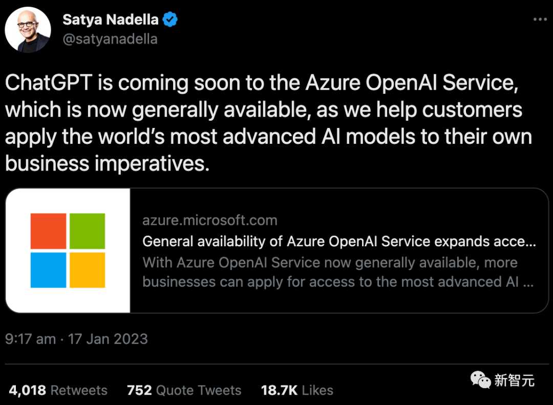 【新智元导读】微软又双叒出大招了!ChatGPT即将整合进Azure,谷歌一个月惨遭Triple Kill。2023刚开年,微软就杀疯了! 搜索引擎必应、办公全家桶Office、云计算平台Azure,相继加入当今最火爆AI语言模型——ChatGPT。 吓得谷歌赶紧拉DeepMind下场,急推Sparrow语言模型测试版,试图在今年晚些时候迎战ChatGPT。 但很显然,微软并没有打算给它任何喘息的机会—— CEO纳德拉:微软旗下所有产品,即将全线整合ChatGPT! 起手超位,以示尊敬 微软:产品线全面整合ChatGPT在周二举行的达沃斯世界经济论坛《华尔街日报》座谈会上,CEO纳德拉表示,微软将迅速采取行动,力争让OpenAI的工具快速商业化。 「届时,微软的每个产品都将具备相同的AI能力,彻底改头换面。」 最近,圈内人都为微软的「大手笔」而震惊——微软在2019年宣布给OpenAI投资10亿美元投资,而最近,微软打算联合其他投资者再投100亿美元。 此次融资后,OpenAI的全新估值将达到惊人的290亿美元。 这个时间当口很微妙——最近几个月,正赶上OpenAI的ChatGPT火爆全网。显然,通过,ChatGPT,微软看到了AI技术掀起革命风暴的潜力。 再投100亿,微软赢麻了可以说,ChatGPT诞生得很是时候,就在OpenAI资金已近枯竭的时候,ChatGPT展现的商业潜力吸引来了大把风投。 当然,微软在OpenAI身上押注,也有着充分的理由。 根据最近披露的投资协议,在收回投资前,微软将获得OpenAI 75%的利润,收回投资后,交易将恢复到OpenAI所有权的结构,其中微软持有49%的股份。 总而言之,如果OpenAI发展顺利,微软将成最大受益者。 Azure+ChatGPT,强到令人发指 就在11月16日,微软又双叒有了大动作——纳德尔正式官宣,将在Azure中整合进ChatGPT。 微软表示,通过公司旗下的云计算平台Azure,会更多客户获得来自OpenAI工具背后的软件。 根据纳德拉的发言,微软的目的是使Azure成为「任何人以及所有思考人工智能的人想要去的地方」,包括企业和终端用户。 目前,Azure是全球唯一提供人工智能超级计算机的公共云,具有大规模扩展和延伸的能力。 与此同时,Azure在全球TOP500超级计算机中排名前15位,是当今排名最高的全球云服务提供商。 难怪世界领先的人工智能公司——包括OpenAI、Meta、Hugging Face等,都会选择用Azure来推进自己的AI创新。 其实,早在两年前,微软就已将OpenAI服务整合进Azure。只不过最近,OpenAI真的风头太盛了,使得这个消息更具爆炸性。 在2021年11月,微软就首次推出Azure OpenAI服务。这个服务使客户能够使用大规模生成式AI模型。Azure是OpenAI API的模型系列背后的核心计算能力,用于研究和开发。 我们都知道,OpenAI提供了大量丰富的AI模型,它们加速了构建自然语言体验的过程,从而极大地改善我们与APPs的交互方式,以及从数据中提取知识的方式。 而整合进OpenAI 的Azure,具备超强的潜力。 从开发者的角度说,它最令人惊喜的地方就是,能让他们使用GPT-3、Codex和DALL-E 2等顶尖模型构建全新的体验。 Azure OpenAI Studio可以让用户在把自己的想法写进代码时,先试验一遍。试验成功后,用户可以从代码中调用这个服务,像其他REST API一样。 使用Power Platform中的Co-pilot,用户能够编写Power Fx命令,甚至实现自动化流程。 在设计软件中,Azure OpenAI使用了DALL·E 2模型,在提示栏中不断明确自己的要求,软件就会生成越来越符合用户要求的图像。 可以看出,这些软件不仅仅是围绕API放置一个应用程序框架,OpenAI模型让用户可以获得更加动态、交互和差异化的体验,而不仅仅是在传统机器学习的意义上训练模型。 而且很多时候,用户不止是要zero-shot模型,还需要微调,而Azure OpenAI就能做到这一点。你可以选择基础模型,加上你输入的额外数据。 这样,开发者就可以有一个全景。 我们还可以用Azure OpenAI畅玩Minecraft。 比如这个视频中,演示者创建了一个名为conjure的mod,当我们输入自然语言消息时,就能使用Codex模型将这个命令传递给Azure OpenAI。随后我们的意图就被解释清楚,传回了Minecraft可以理解的命令。 ChatGPT整合进必应:挑战谷歌搜索老大哥这不,就在ChatGPT推出一个月后的1月3日,突然有消息爆料称,微软正致力于把ChatGPT整合进自家的搜索引擎必应Bing。 按照计划,今年3月底前,这个雄心勃勃的项目就能正式问世。 而叠加了ChatGPT buff的必应会直接给出一个完整的回答,以及信息的来源。 有了ChatGPT加持,必应就可以根据搜索问题,提供一个与之相关的查询结果,即使提问中并没有出现这些关键词。同时,必应也会为用户解释这个结果与原始问题的关联性是什么。 与此同时,必应还可以更进一步地建议用户通过其他关键词,来查找相关搜索的答案。 也就是说,我们不必再像现在这样,每次都要挨个点开下面给出的链接,寻找自己想要的结果。 这省去的一步,或许将直接改写「搜索引擎」的产品形态。 ChatGPT进驻Office:今后的PPT就靠你了 还没等谷歌喘口气,1月7日又有一个爆炸性消息被放出——微软计划在Word、PowerPoint、Outlook等软件中,悉数加入ChatGPT等AI。 想象一下,在你需要请假时,只要随手打出「写一封请病假的邮件」几个字,Outlook就能秒秒钟把措辞正式的请假申请写好,直接点击发送即可。 具体来说,在Outlook邮箱中,即使用户没有输入确切的关键字,应用也可以在ChatGPT的加持下了解客户可能正在搜索哪些电子邮件。 另外,微软的高管和研究人员最近还研究了Outlook和Word如何使用GPT自动回复电子邮件,或改进用户的写