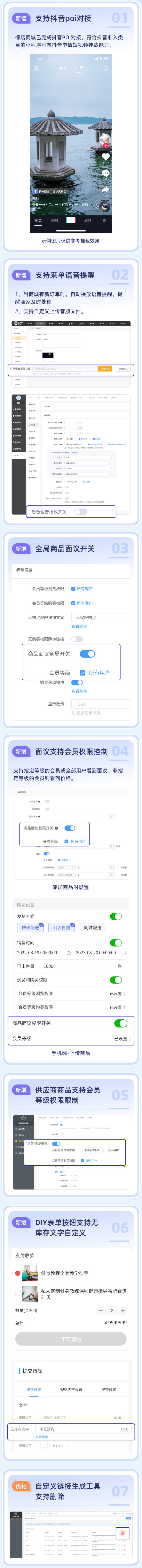 新增:支持抖音poi对接(用于抖音短视频挂载抖音小程序);新增:支持来单语音提醒;新增:全局商品面议开关;新增:面议支持会员权限控制;新增:供应商商品支持会员等级权限限制;新增:DIY表单按钮支持无库存文字自定义;优化:自定义链接生成工具支持删除。