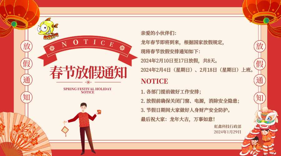 [放假通知]2024年虹鑫伟业网络科技春节放假安排